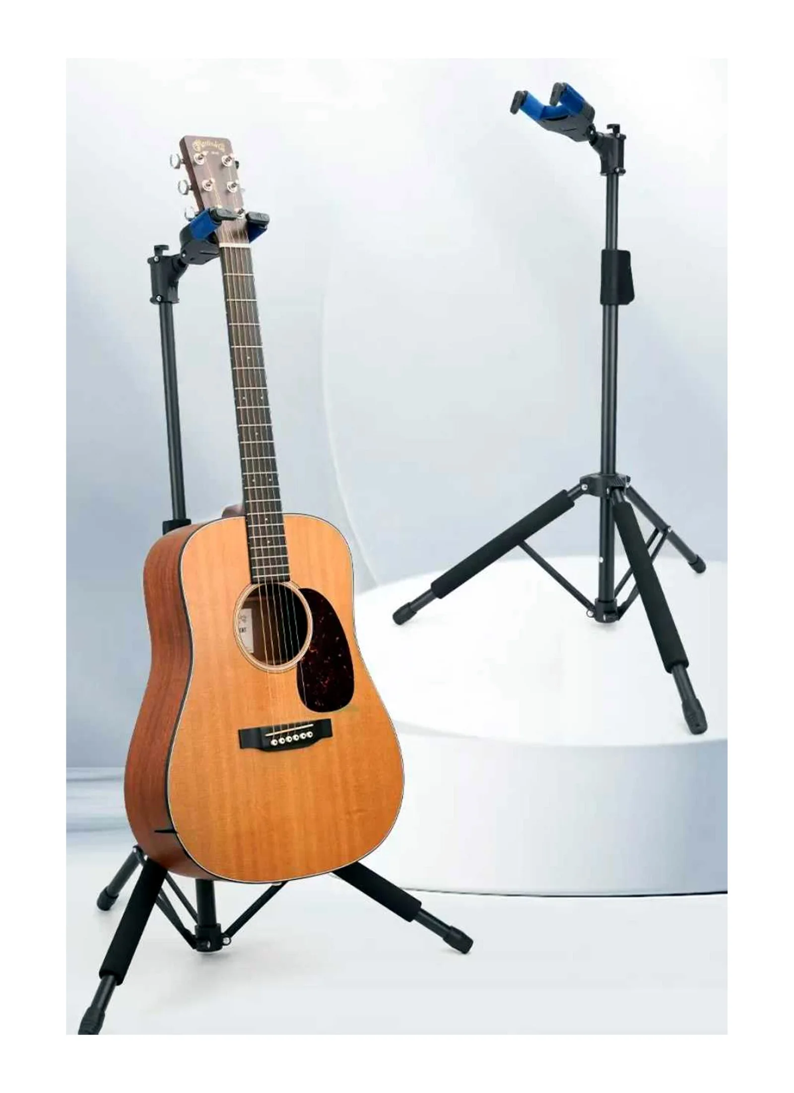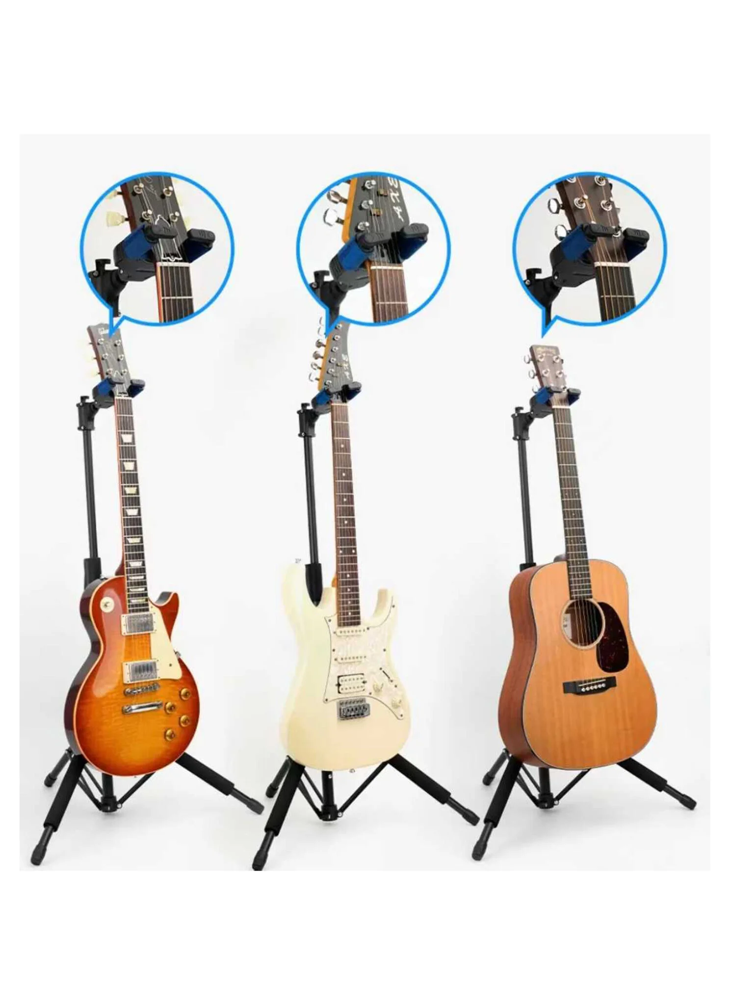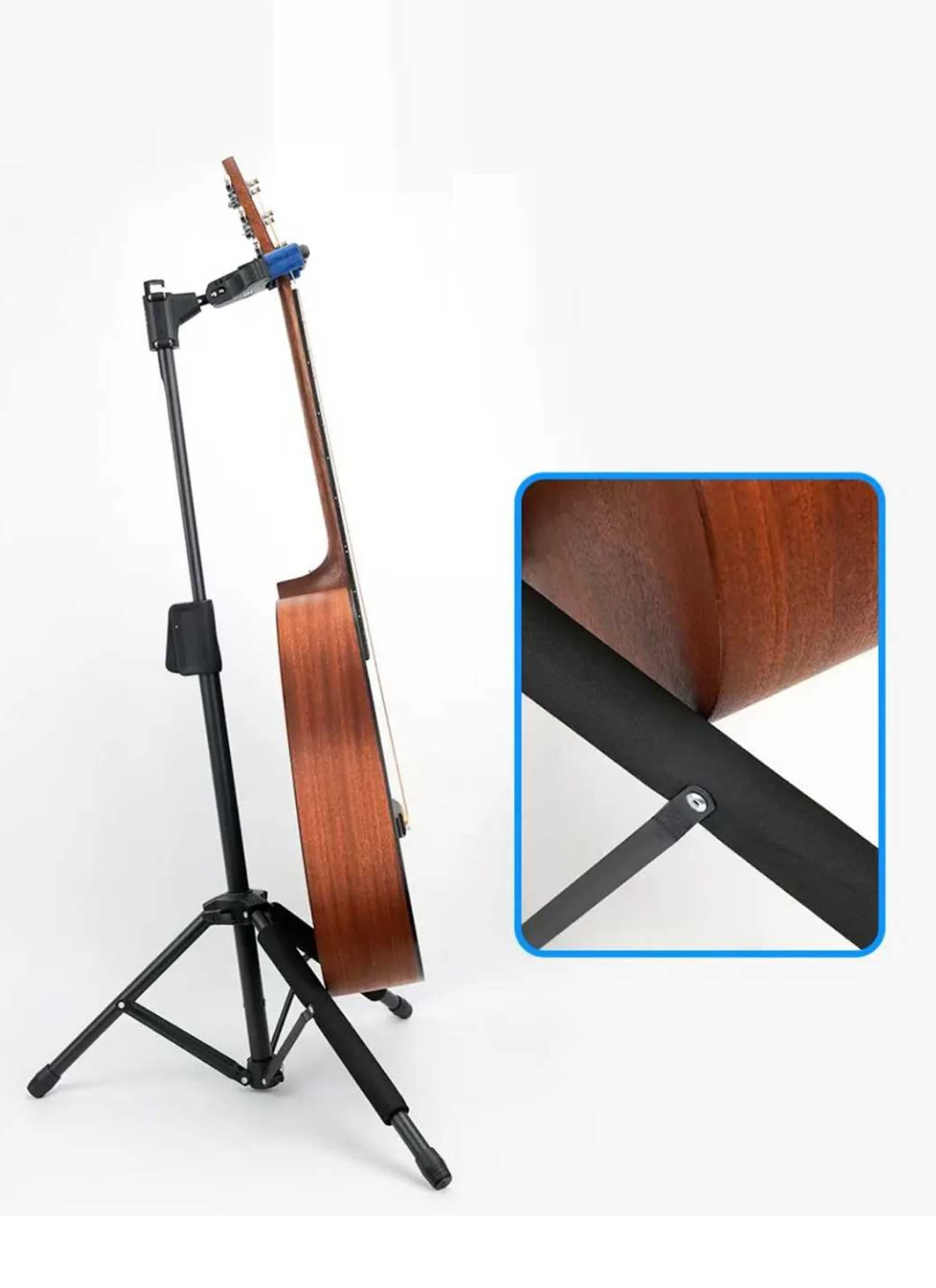 The hook has an interlocking lock that automatically closes the gate when the guitar is weighed down, protecting the guitar from falling. The height of the stand is adjustable, suitable for guitars of various sizes and most shapes. There is an extra hook on the top to hang a guitar case. It is foldable, making it easy to carry.