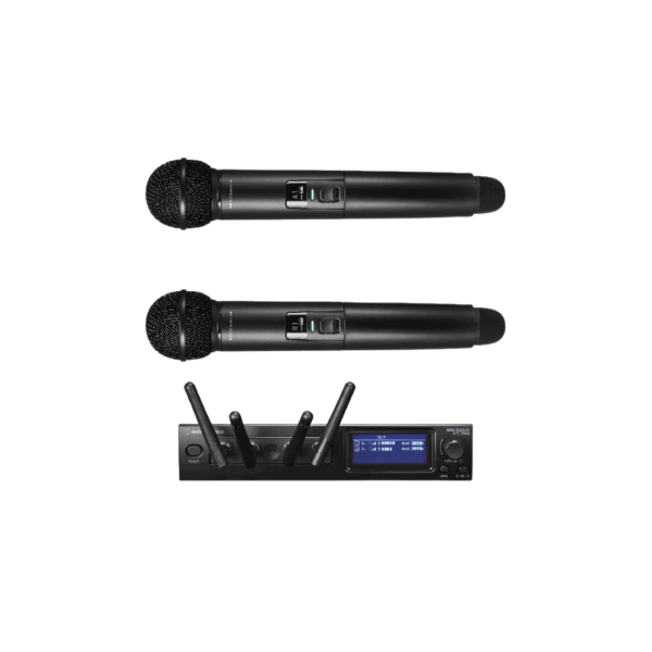 System 20 Digital Wireless System includes ATW-R1440 4-channel receiver and two ATW-T1402 handheld microphone transmitters.