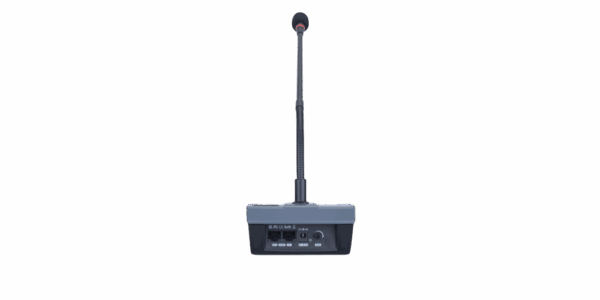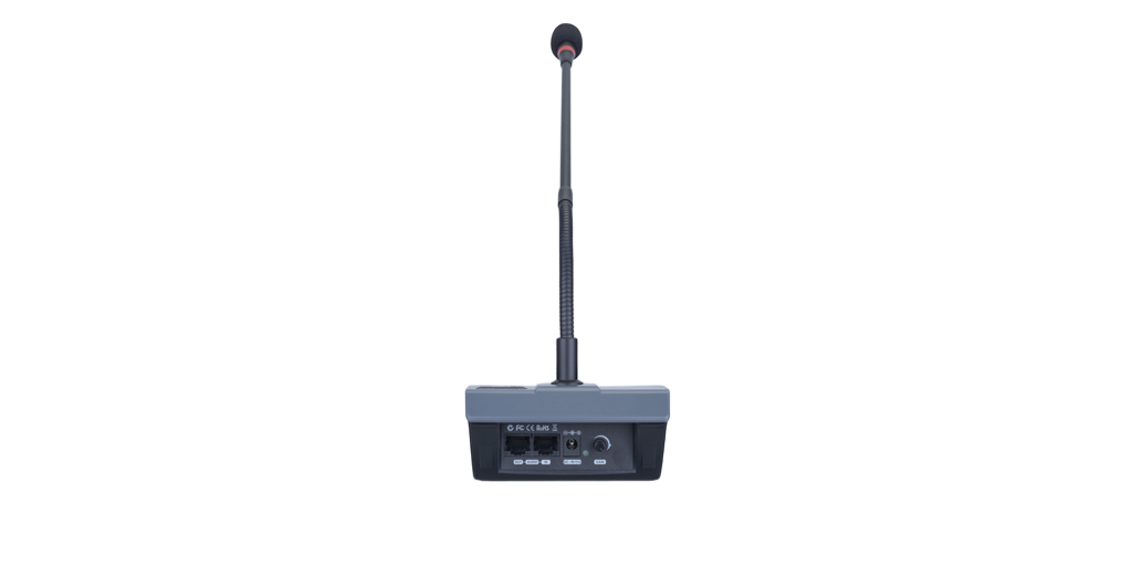 This MDS system has a unique circuit loop design with an easy set-up using standard CAT5 cables for linking up to 20 units in a daisy chain (every microphone and switching adaptor can be located anywhere in the loop). When the chairman presses the mute button, only the chairman unit will be active and all delegates will be muted and deactivated. The delegates can press a button to talk into the flexible gooseneck microphone.