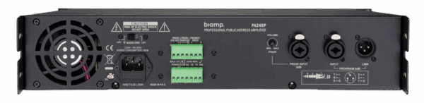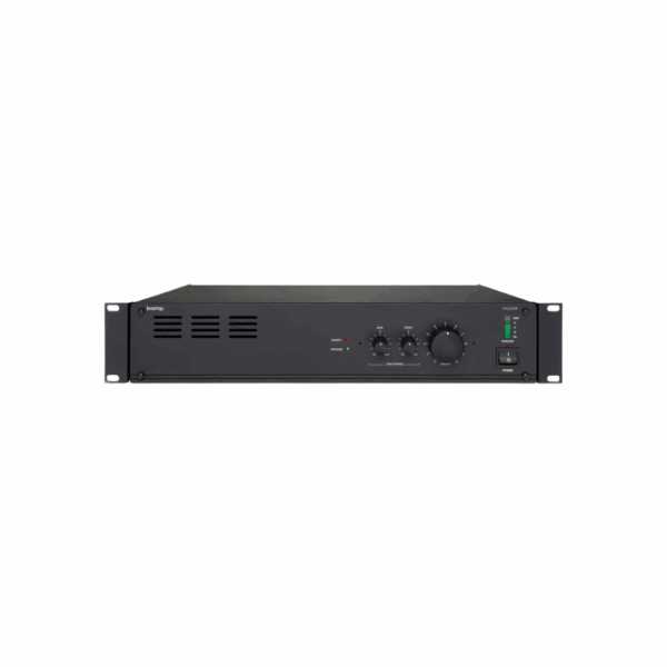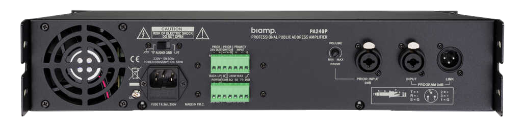 Power amplifier, 240W/100V, program and priority input, 24V priority output, tone control, 24V DC – 230 V AC.