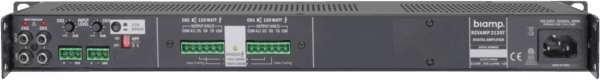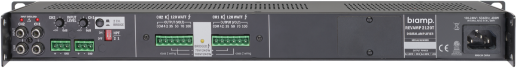 The REVAMP2120T is a 2-channel digital power amplifier that provides 2 x 120 watts output power @ 100 volts or @ 4 ohms, and can be bridged into a powerful 240 watts @ 100 volts or 8-ohm single amplifier.