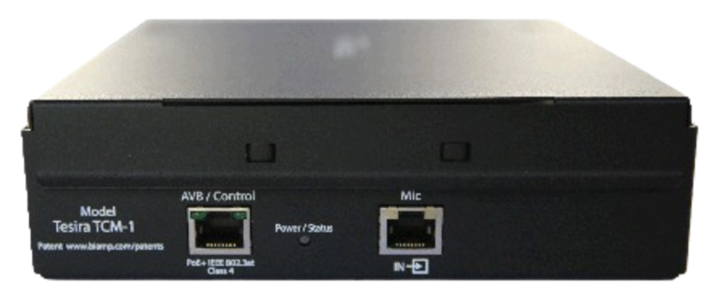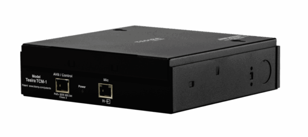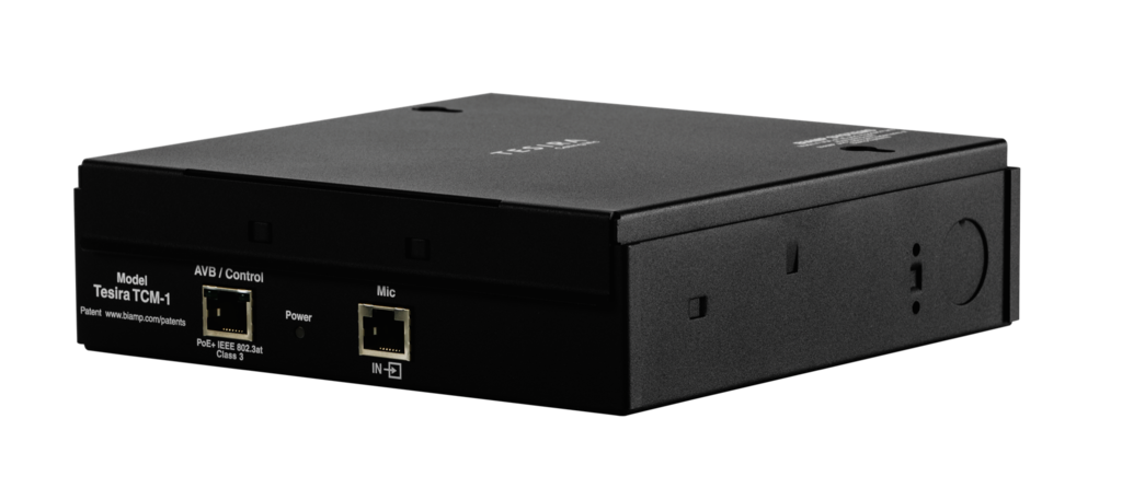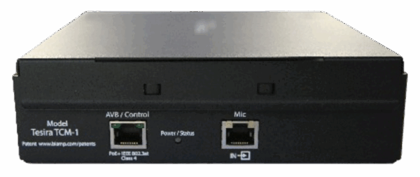 The Parlé TCM-1 is an AVB pendant microphone and plenum box. Each microphone includes Beamtracking technology with three 120-degree zones, providing full 360-degree coverage of the meeting space. The plenum box is equipped with an additional RJ-45 connector for daisy-chain connections; a maximum of three microphones are permitted per daisy chain (one TCM-1 or TCM-1A required, plus up to two TCM-1EX).