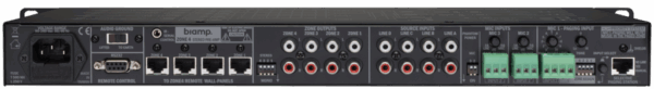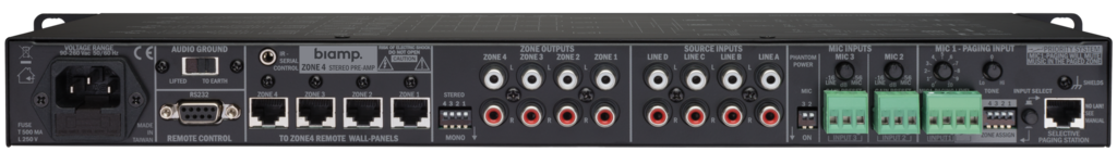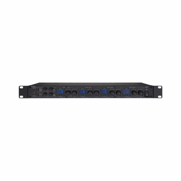Quad-zone preamplifier; 4 stereo output zones; 3 mono mic/line + 4 stereo line inputs.
