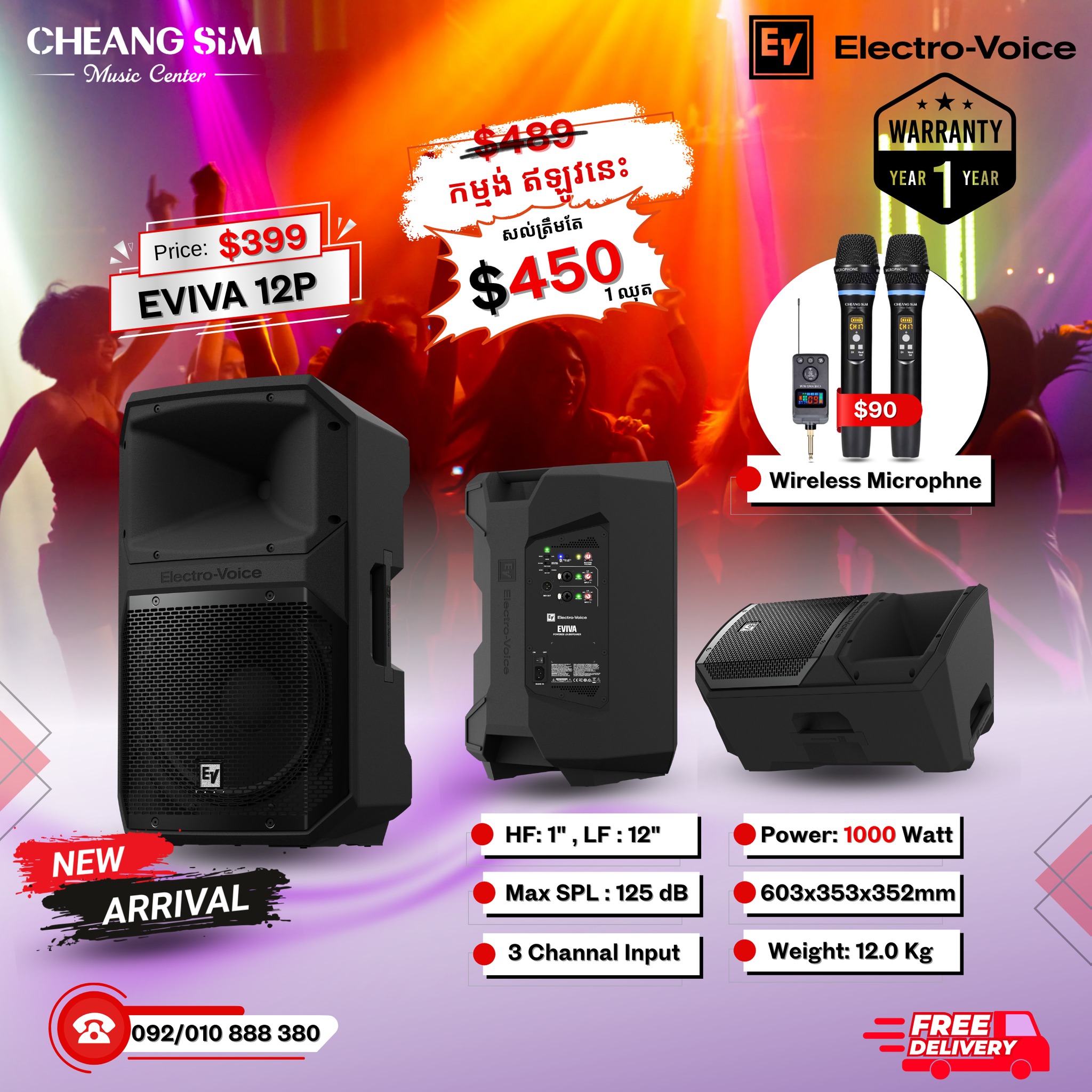 The EVIVA 12P is a 12” powered portable loudspeaker that brings Electro-Voice quality sound and durability to aspiring musicians, DJs, and small venues. It has been designed for rapid deployment, so its user-friendly control and easy connectivity combine well with a lightweight design to ensure single-person setup is possible. EVIVA 12P can be combined with other members of the EVIVA family to create class-leading systems.Electro-Voice has launched the EVIVA family to deliver best-in-class performance from a performance focused portable powered loudspeaker. To ensure optimal sound quality not usually found in this category of loudspeaker, EVIVA features Electro-Voice’s patented SST (Signal Synchronized Transducers) and a custom-designed, high-energy neodymium high frequency compression driver.Weighing just 12 kg, EVIVA 12P offers a 90° x 60° (horizontal x vertical) coverage pattern, delivering clean, even sound across the audience area. EVIVA 12P has a frequency range of 50 Hz – 20 kHz (-10 dB) and a maximum SPL of 125 dB delivering class-leading sonic performance. It offers industry standard connectivity to make setting up any gig as fast as possible with two XLR combo jack mic/line inputs, an XLR mix output, and Bluetooth® audio streaming. Put through the same rigorous testing as every Electro-Voice loudspeaker, EVIVA 12P delivers a consistent performance that can be relied on every time.The 2-way full range system features a robust composite enclosure, 1000 Watt amplifier, and 2-channel analog input section. The intuitive control panel features knobs for level adjustment and switches to change the mode between Music and Live and high pass changes between NO SUB and WITH SUB EVIVA 18SP. The loudspeakers are powered via an IEC mains input with auto-switching universal 100 V ~ 240 V mains voltage input – included power cord varies per region.