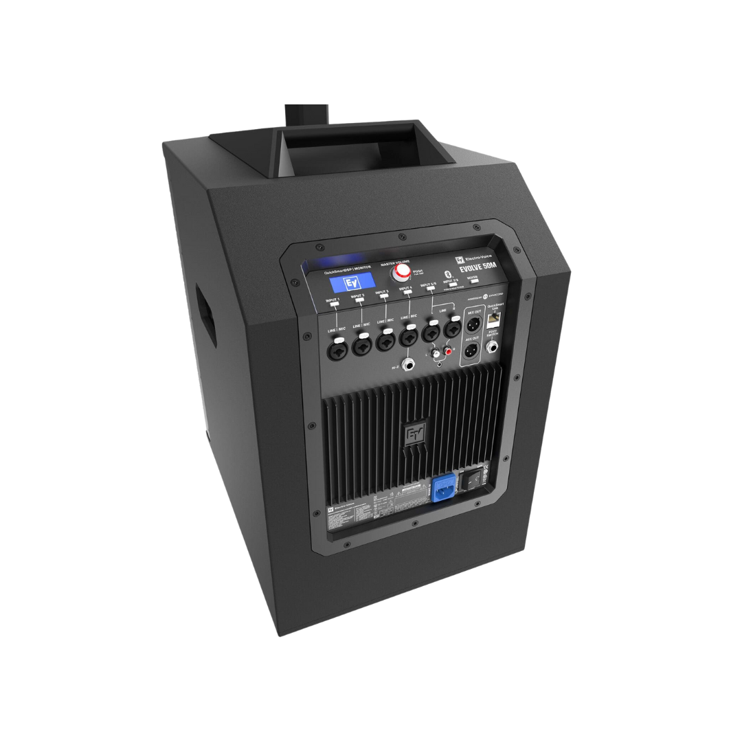 The black Electro-Voice EVOLVE 50M Portable 1000W Bluetooth-Enabled Subwoofer is part of the EVOLVE 50M portable PA system, which consists of a powered subwoofer, magnetic speaker pole, and a column array full-range speaker. The powered subwoofer utilizes a 12″ driver and is powered by the integrated 1000W (500W to subwoofer) amplifier, which combines with the column array to provide a frequency response of 43 Hz to 20 kHz with a maximum SPL output of 127 dB.System setup is simple and fast. Slide the magnetically locking mounting pole into the appropriate port on top of the subwoofer, then place the column speaker array on the pole. You don’t have to run cables between the sub and speaker array; audio connectivity between them is made via internal cabling in the mounting pole. The EVOLVE 50M subwoofer features an advanced 8-channel mixer with professional grade mic preamps and mix functions. High-resolution, low-latency Bluetooth audio streaming ensures professional-quality results for music playback or accompaniment.There are mic, line, and Hi-Z inputs via XLR-1/4″ combo jacks, stereo RCA, and 3.5mm aux input jacks as well as XLR aux and mix outputs. The onboard DSP functions include four presets (Music, Live, Speech, Club), three-band system EQ (low, mid, high), seven-band graphic EQ (in Mixer mode), five user-programmable presets (Store and Recall settings), phantom power, visual monitoring of limiter status, input level control and meters, and a master volume control to optimize gain structure. The Electro-Voice EVOLVE 50M subwoofer ships with a power cord.