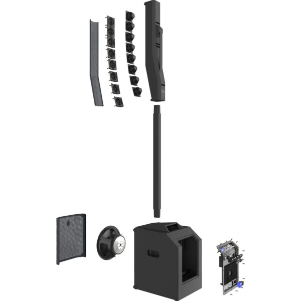 The lightweight, active PA setup is designed to provide high-powered, wide-range frequency reproduction for sound engineers, presenters, and DJs in clubs, parties, concert venues, and live stage events. The kit includes the powered subwoofer, magnetic speaker pole, column array speaker, power cord, and carry bag for the speaker pole and column array.