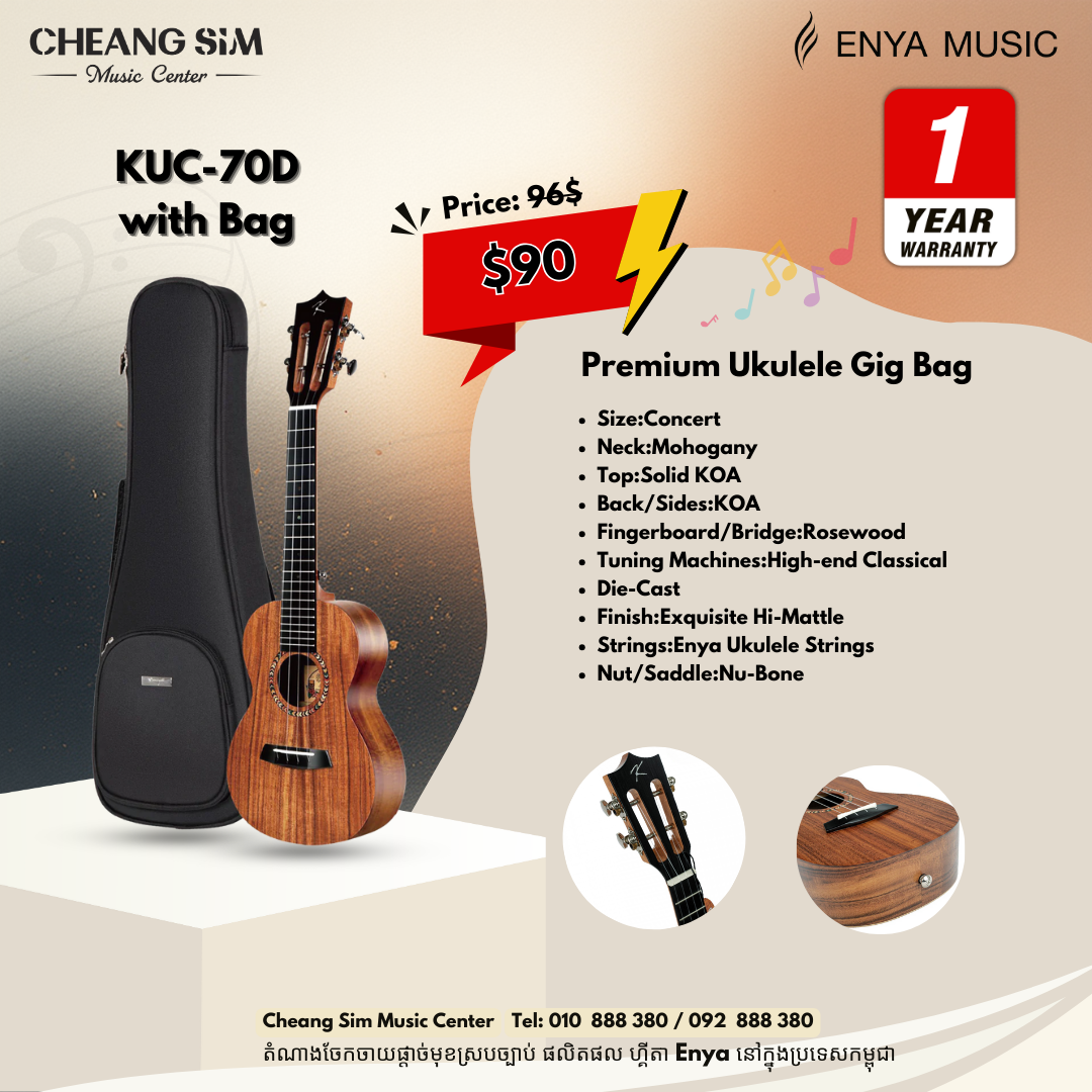 Size:Concert Neck:Mohogany Top:Solid KOA Back/Sides:KOA Fingerboard/Bridge:Rosewood Tuning Machines:High-end Classical Die-Cast Finish:Exquisite Hi-Mattle Strings:Enya Ukulele Strings Nut/Saddle:Nu-Bone Package:Enya Bag