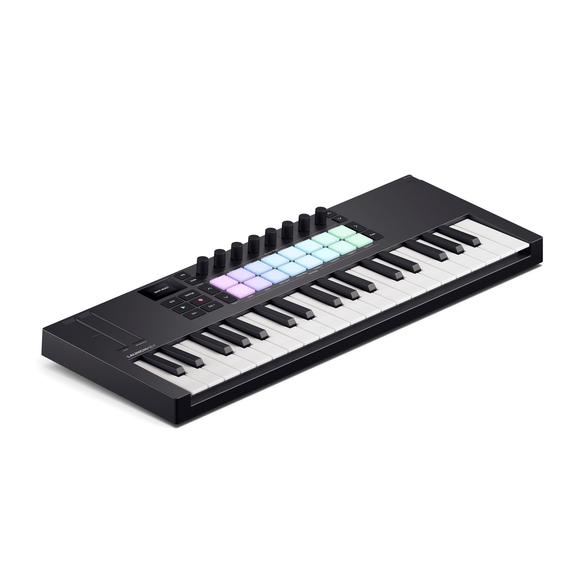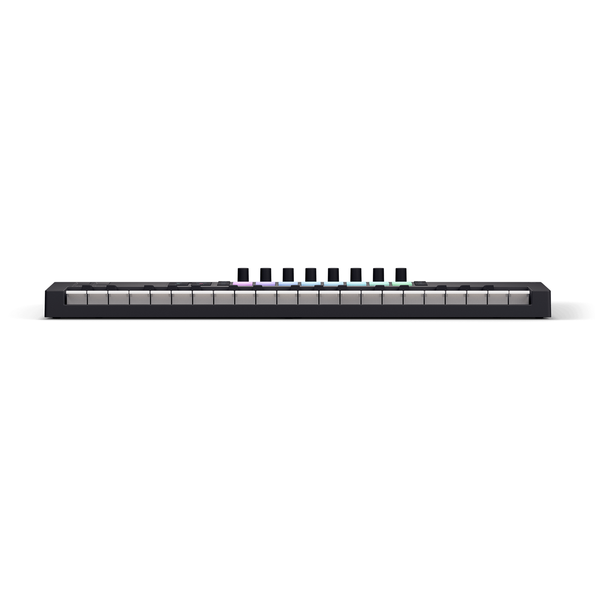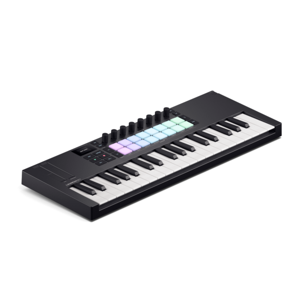 Launchkey Mini 37 is a powerful DAW controller with three octaves of synth-style mini-keys, eight encoders, and 16 velocity-sensitive pads for playing drums and instruments and launching clips. Creative Chord and Scale modes are built right in and work with the OLED display to make staying in key effortless.