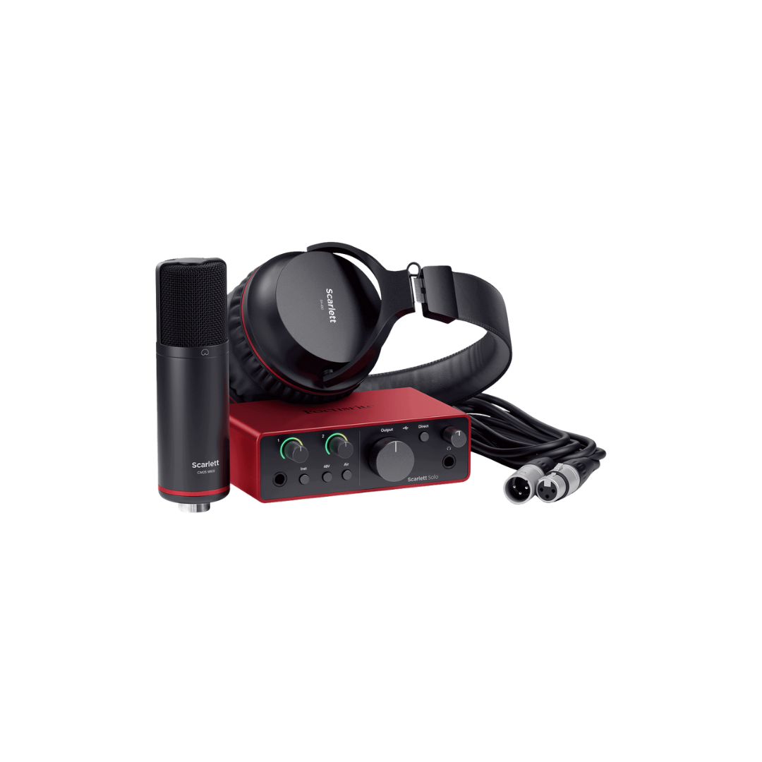 Get everything you need to make your first hit song, right now. Connect the included condenser mic to Solo’s detailed, ultra-low-noise mic pre and it sounds great right away. Plug a guitar into the instrument input. It feels just like an amp. Then listen in stunning clarity with the SH-450 headphones.