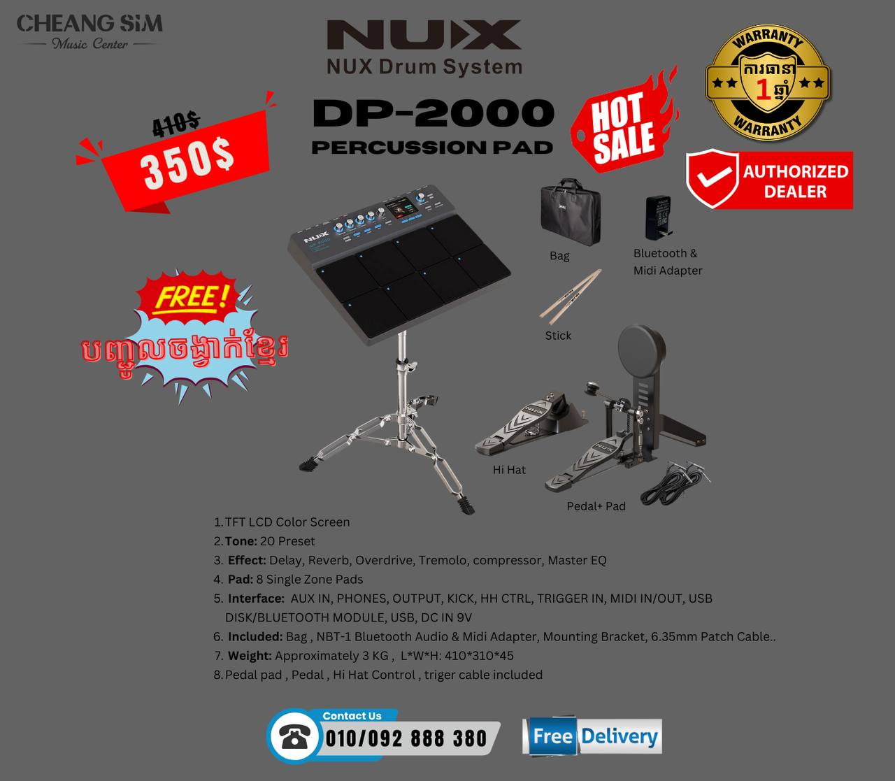The NUX DP-2000Set provides serious musicians with an integrated percussion pad to expand their sound. With eight velocity-sensitive pads, the DP-2000 gives you high-quality acoustic drum samples as well as folk percussion and electronic sounds that you can customize. You can import your own drum samples via USB to create unique patches tailored to your playing style. The DP-2000 also has inputs for external triggers so you can connect a hi-hat pedal and kick drum, turning it into a mini electronic drum set.