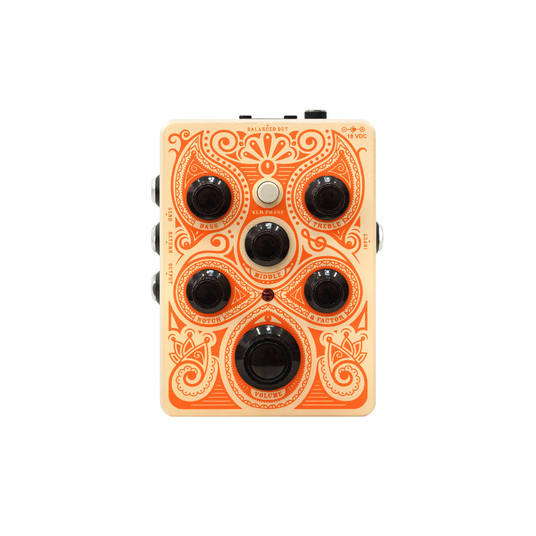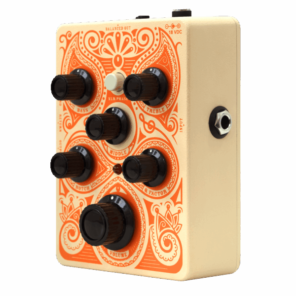 Acoustic instruments can be tricky. When dealing with feedback, finnicky pickups and finding a place in the mix, you need an EQ that is both powerful and simple. The Middle knob works in conjunction with the Notch and Q Factor controls to subtly sculpt your sound or tackle feedback with precision. Fixed-frequency Bass and Treble knobs give you much-needed control over the “body” and “sparkle” of your instrument.