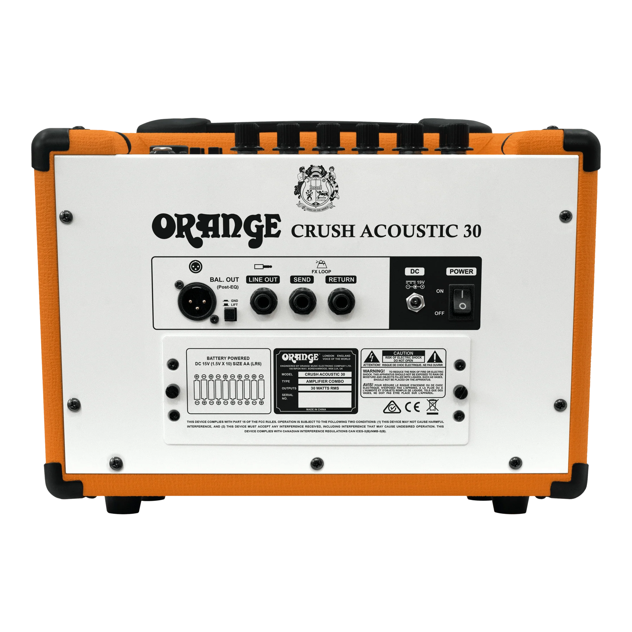 The Orange Crush Acoustic 30 is a compact 30-Watt amplifier designed specifically for acoustic guitarists and vocalists on the move. Featuring independent instrument and mic channels, each with its own EQ and volume control, it ensures crystal‑clear sound and feedback-free performance. The global effects section includes chorus, reverb and a notch filter to sculpt out unwanted resonances. Run it from the mains or on batteries for true portability. Balanced XLR and line outs makes recording a snip, and a buffered effects loop keeps all pedals sounding crisp. With rugged construction and unmistakable Orange character, the Crush Acoustic 30 delivers all you need for flawless acoustic amplification anywhere.