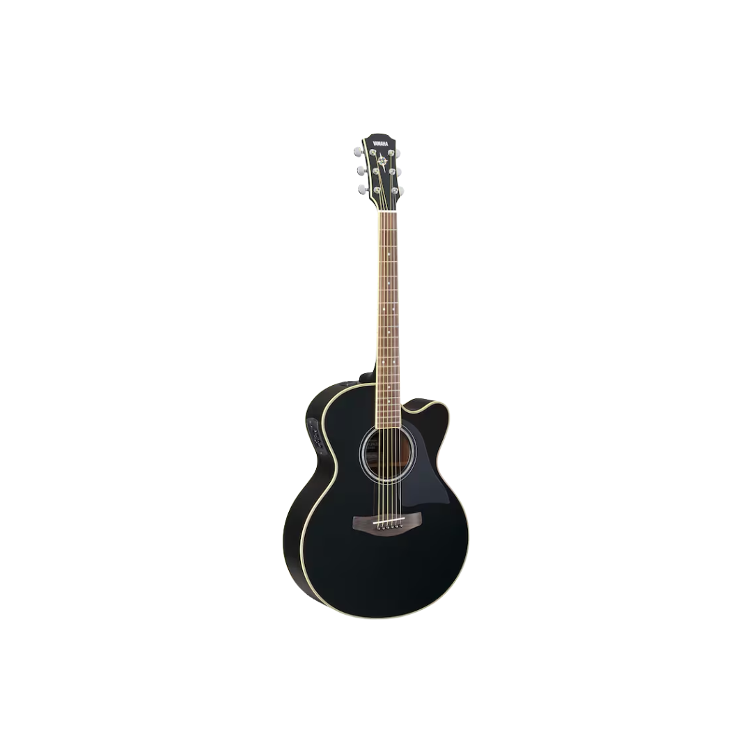 The Yamaha CPX700II B is a 6-string acoustic-electric guitar with a black finish, featuring a medium-jumbo cutaway body for a powerful sound and an A.R.T. pickup system for natural amplified tone.