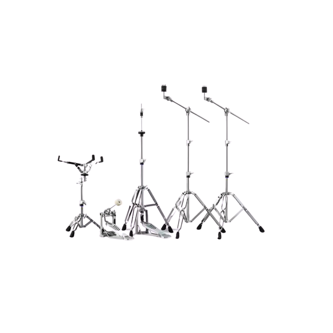 The pack comes with all the essential stands and pedals for a standard 5-piece drum kit.