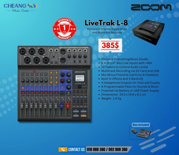 The Zoom PodTrak L8 is a premium 8-channel audio recorder and interface engineered for podcasters and field producers. With four high-gain mic preamps, Bluetooth® monitoring, built-in sound pads, and SD card recording, it offers studio-grade performance on the go. Streamlined workflow, rugged portability, and pro-level features make it ideal for interviews, live shows, and remote productions.
