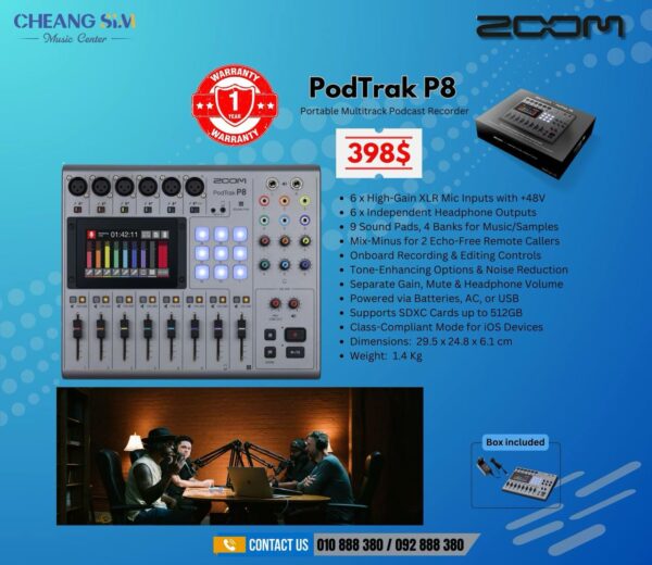 The Zoom PodTrack P8 is a professional 8-channel audio interface and recorder designed for podcasters and content creators. Featuring four XLR/TRS combo inputs with phantom power, intuitive controls, and SD card recording, it delivers studio-quality audio anywhere. Ideal for interviews, live streams, and field recordingsāreliable, portable, and built for seamless production.
